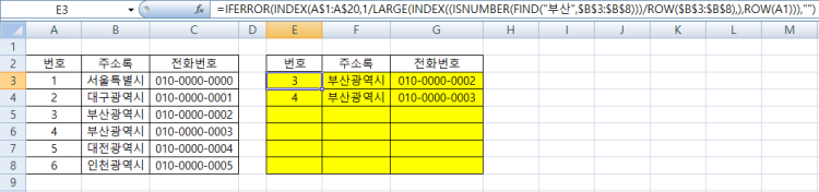 =IFERROR(INDEX(A$1:A$20,1/LARGE(INDEX((ISNUMBER(FIND("부산",$B$3:$B$8)))/ROW($B$3:$B$8),),ROW(A1))),"")